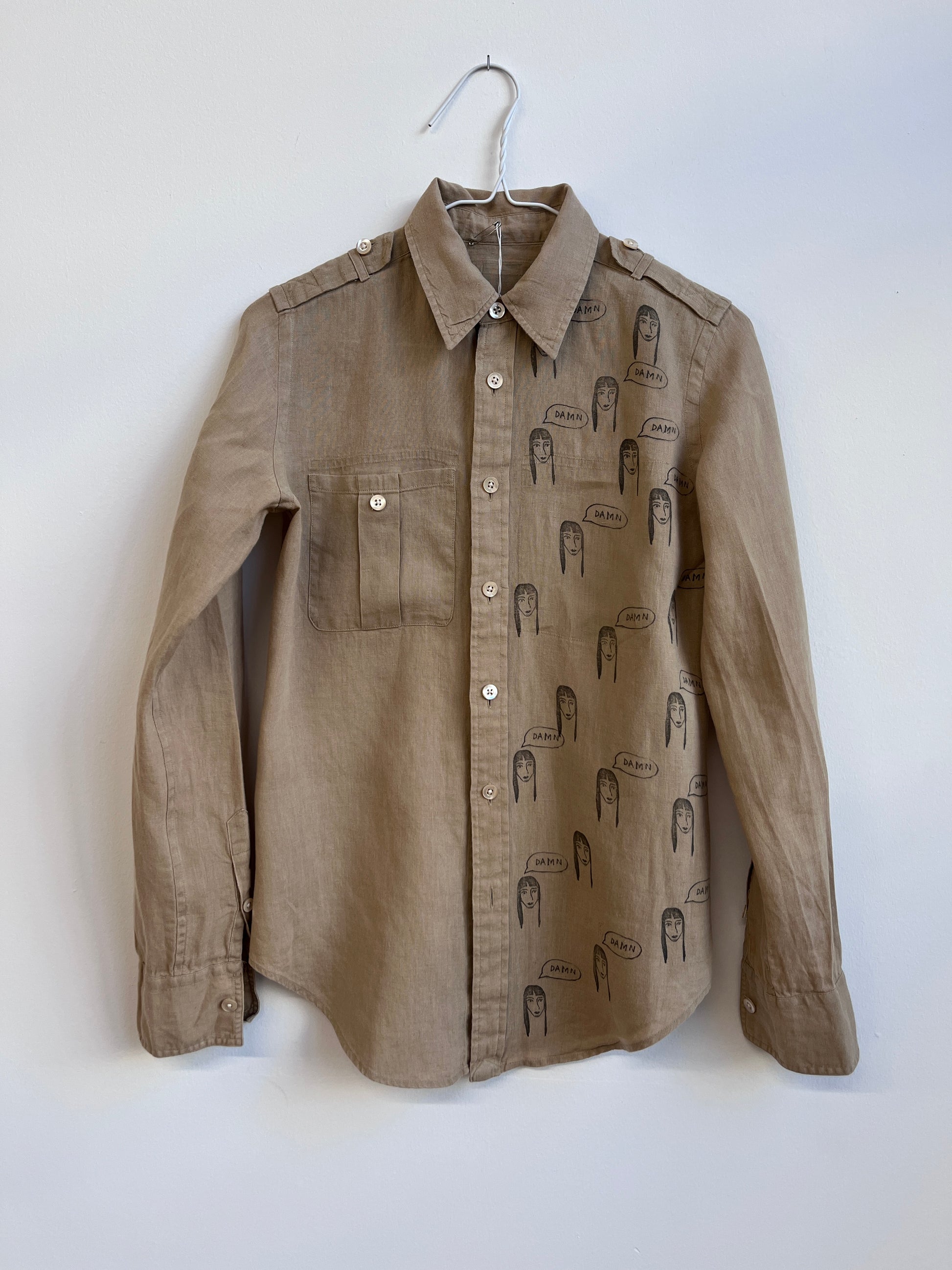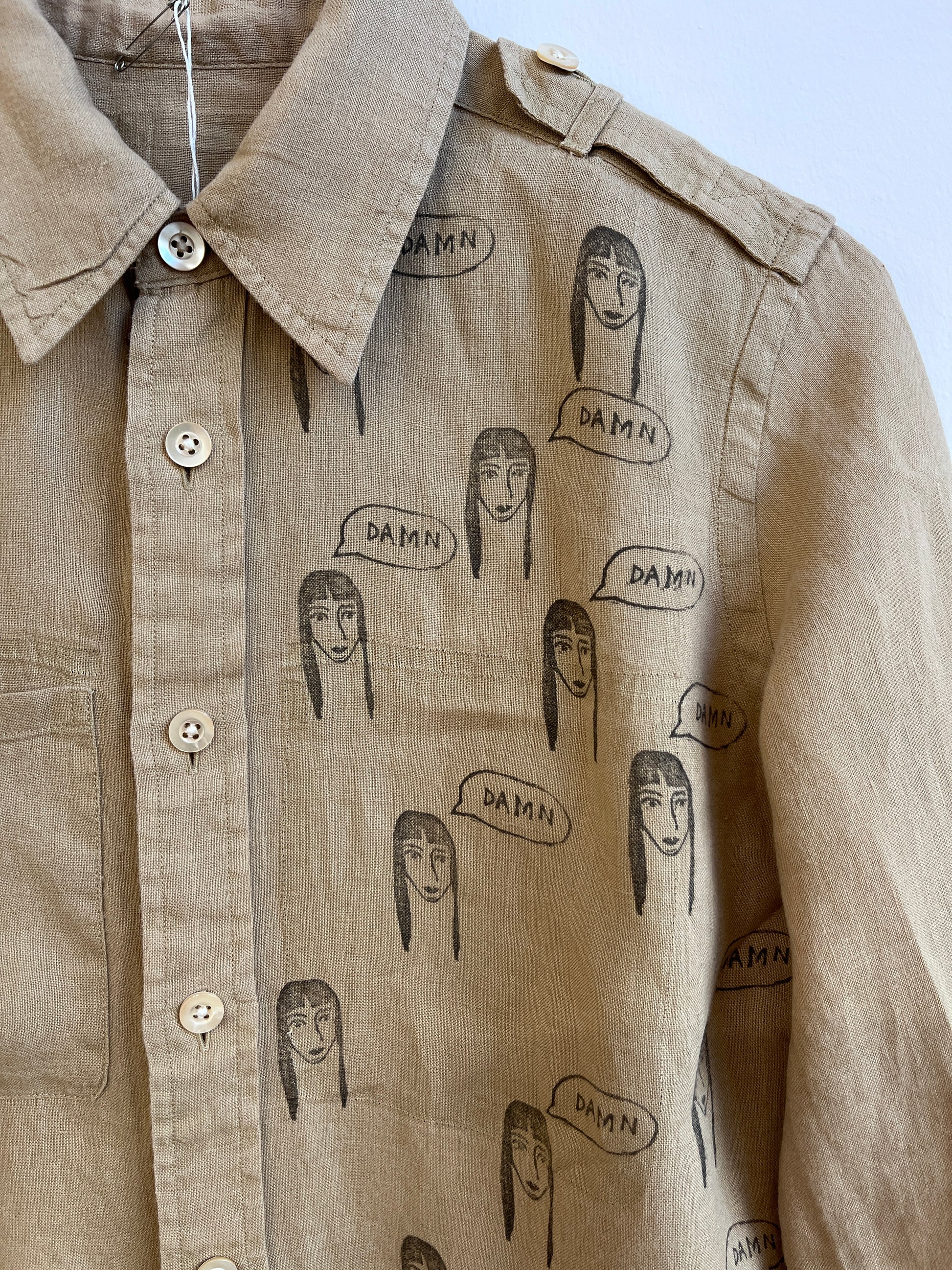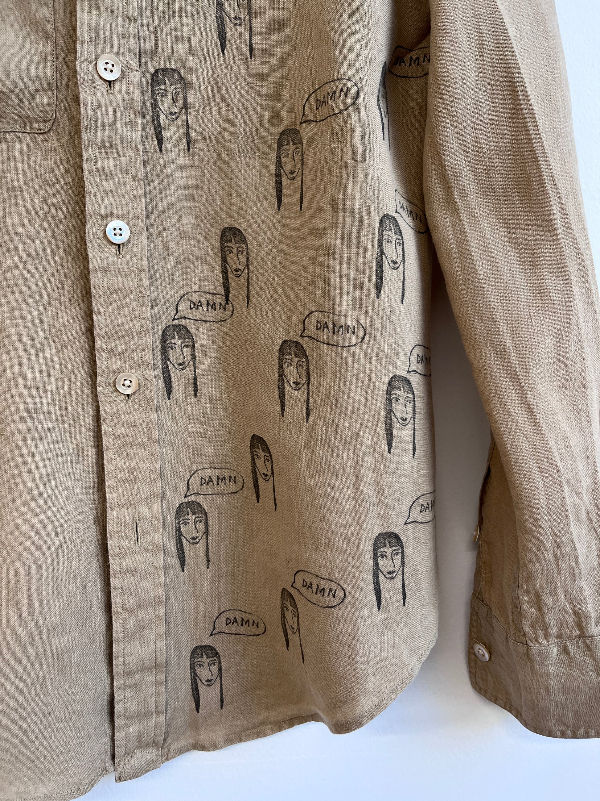 Camel color linen shirt with the damn girl print.