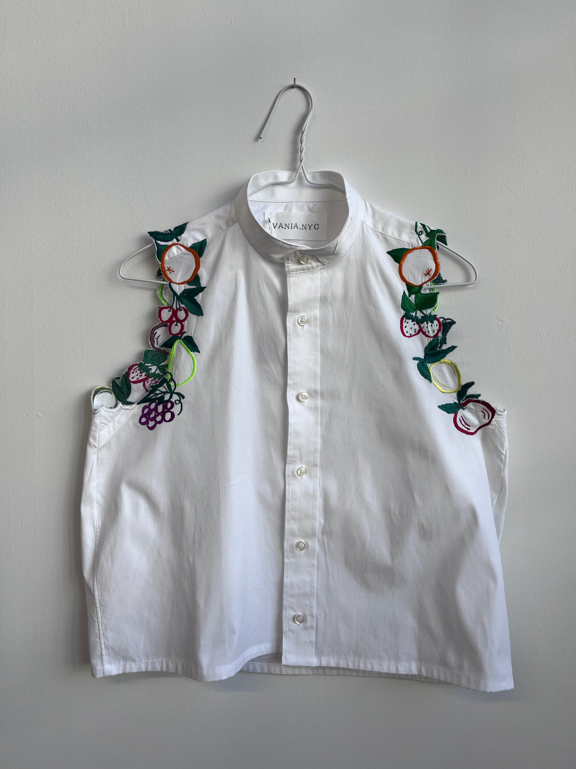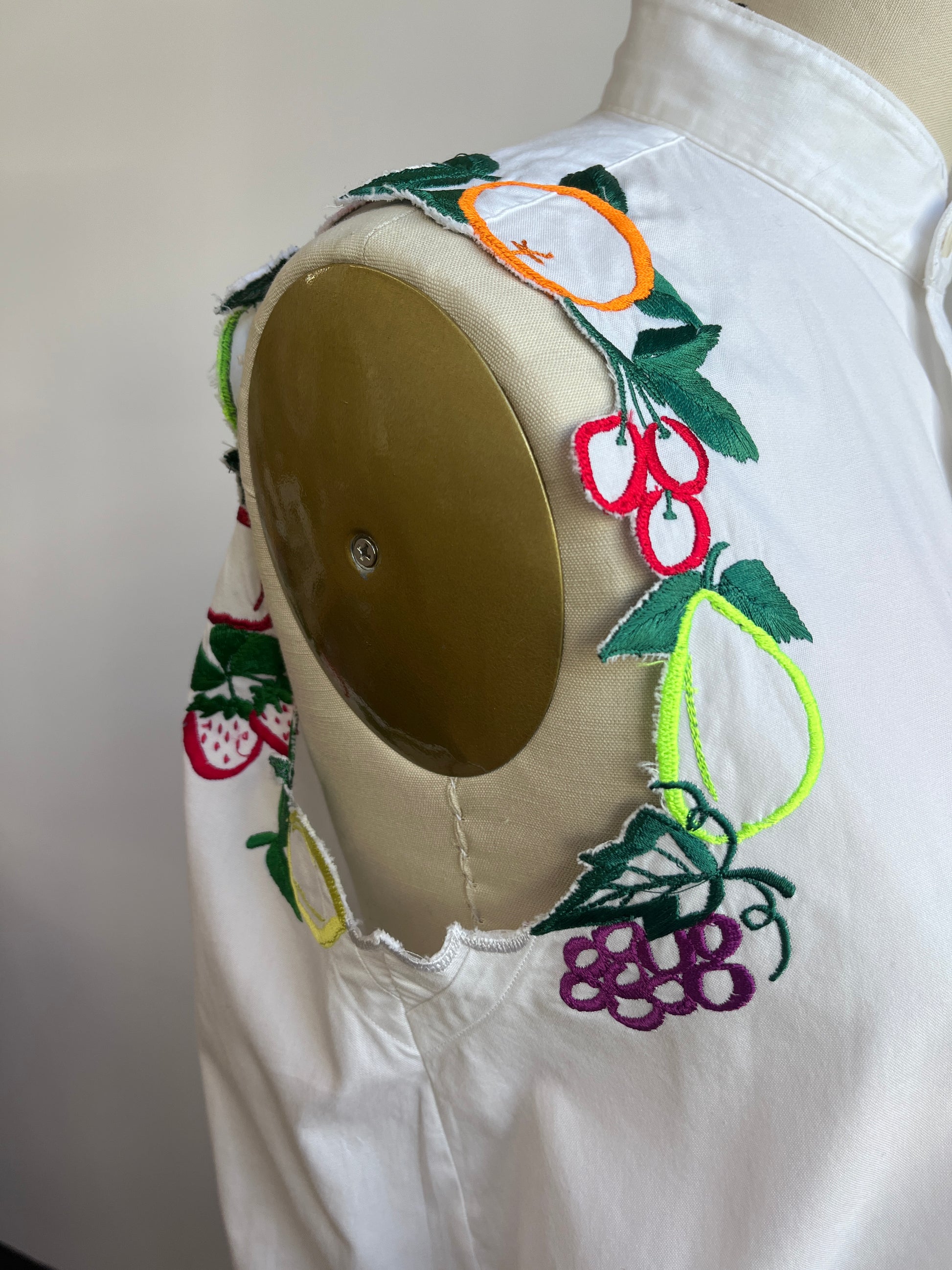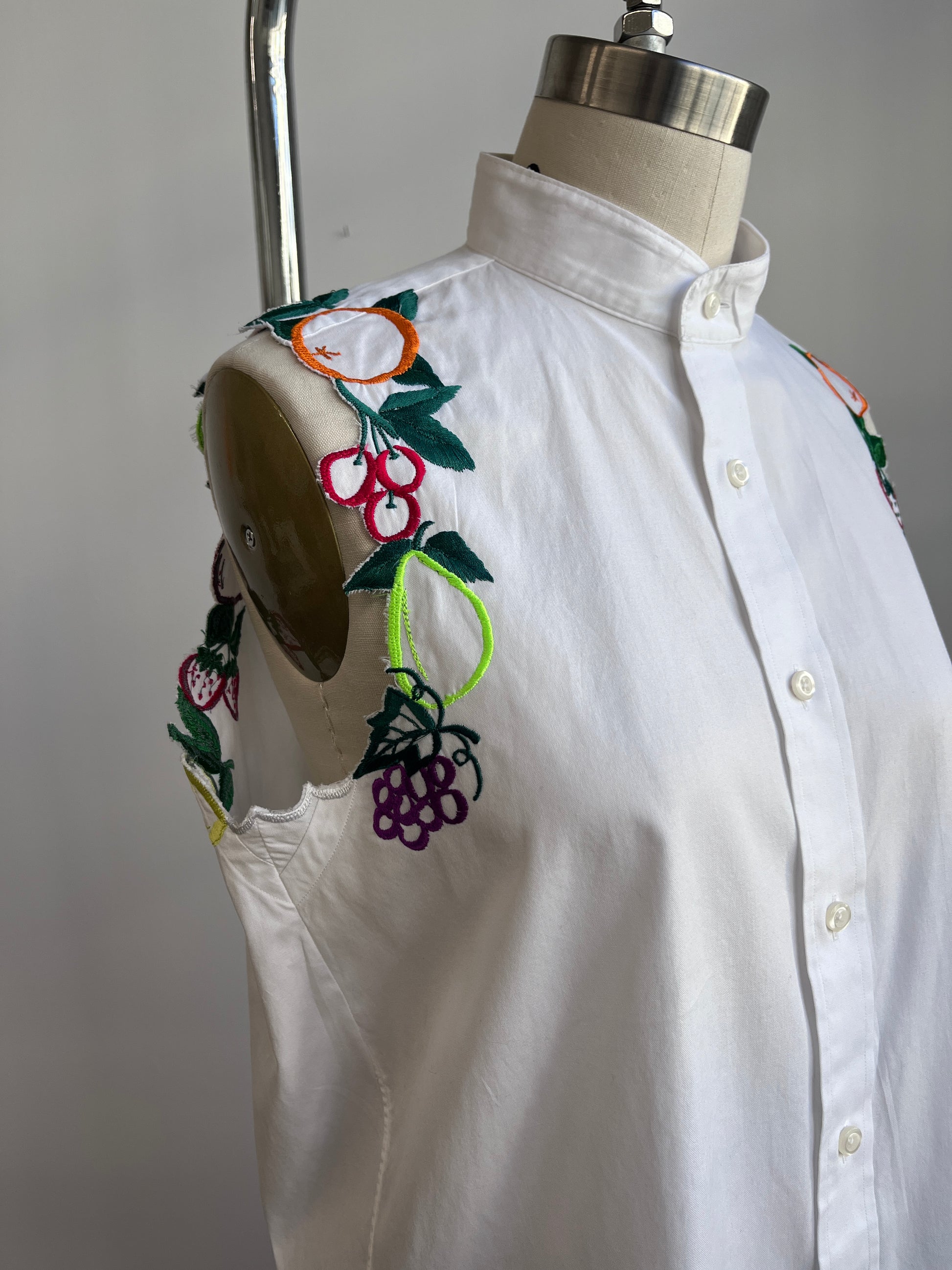 Up-cycled cotton white shirt was cropped and had the sleeves replaced with fruits!