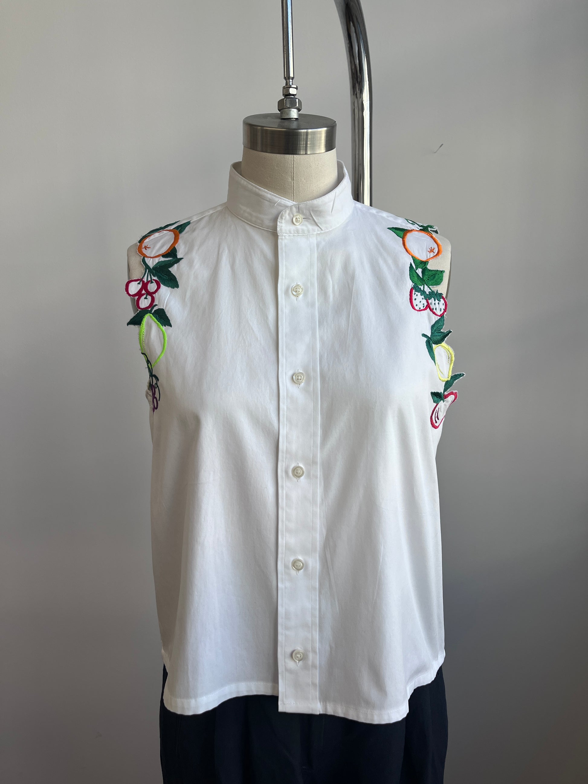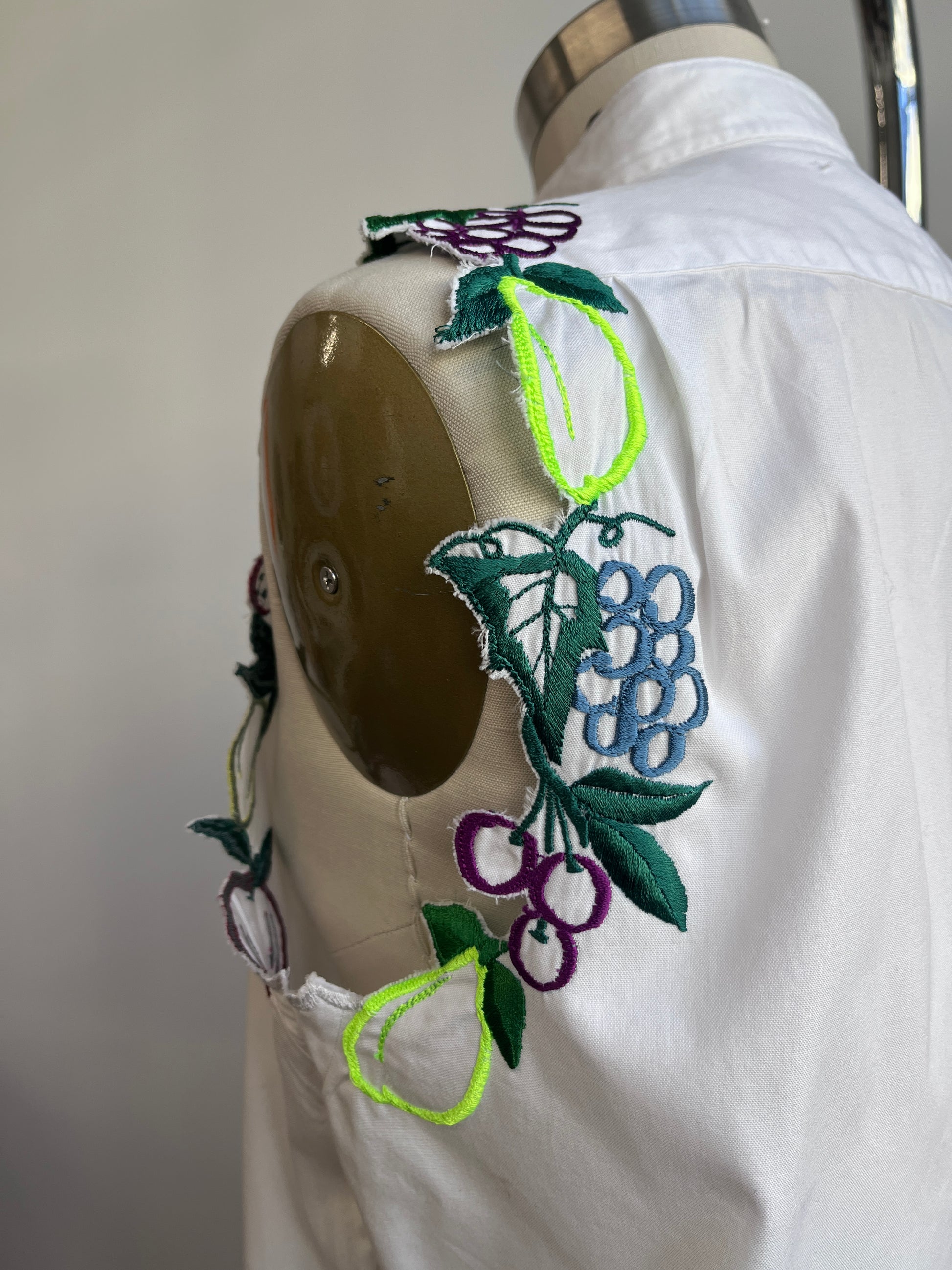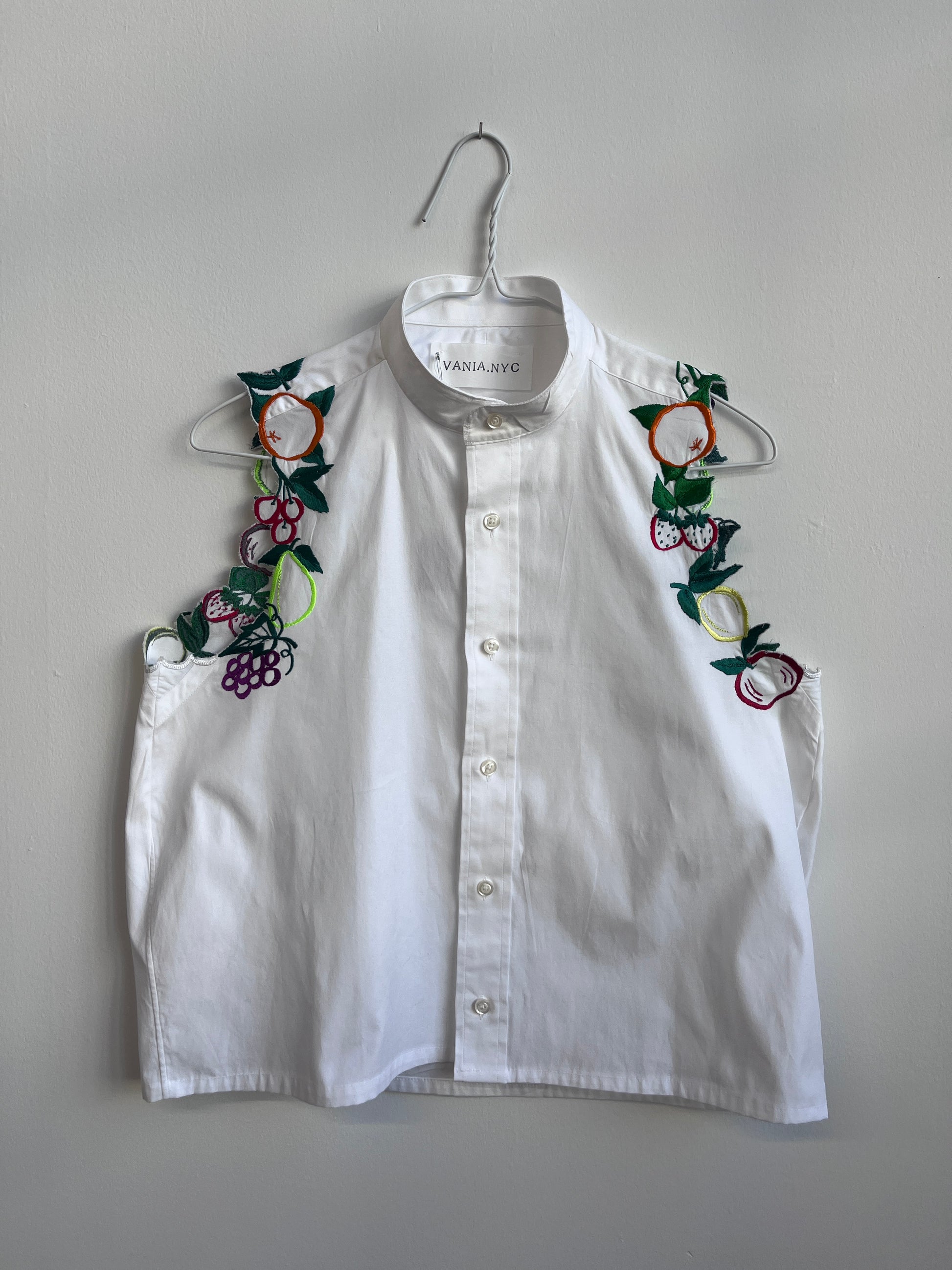 Up-cycled cotton white shirt was cropped and had the sleeves replaced with fruits!